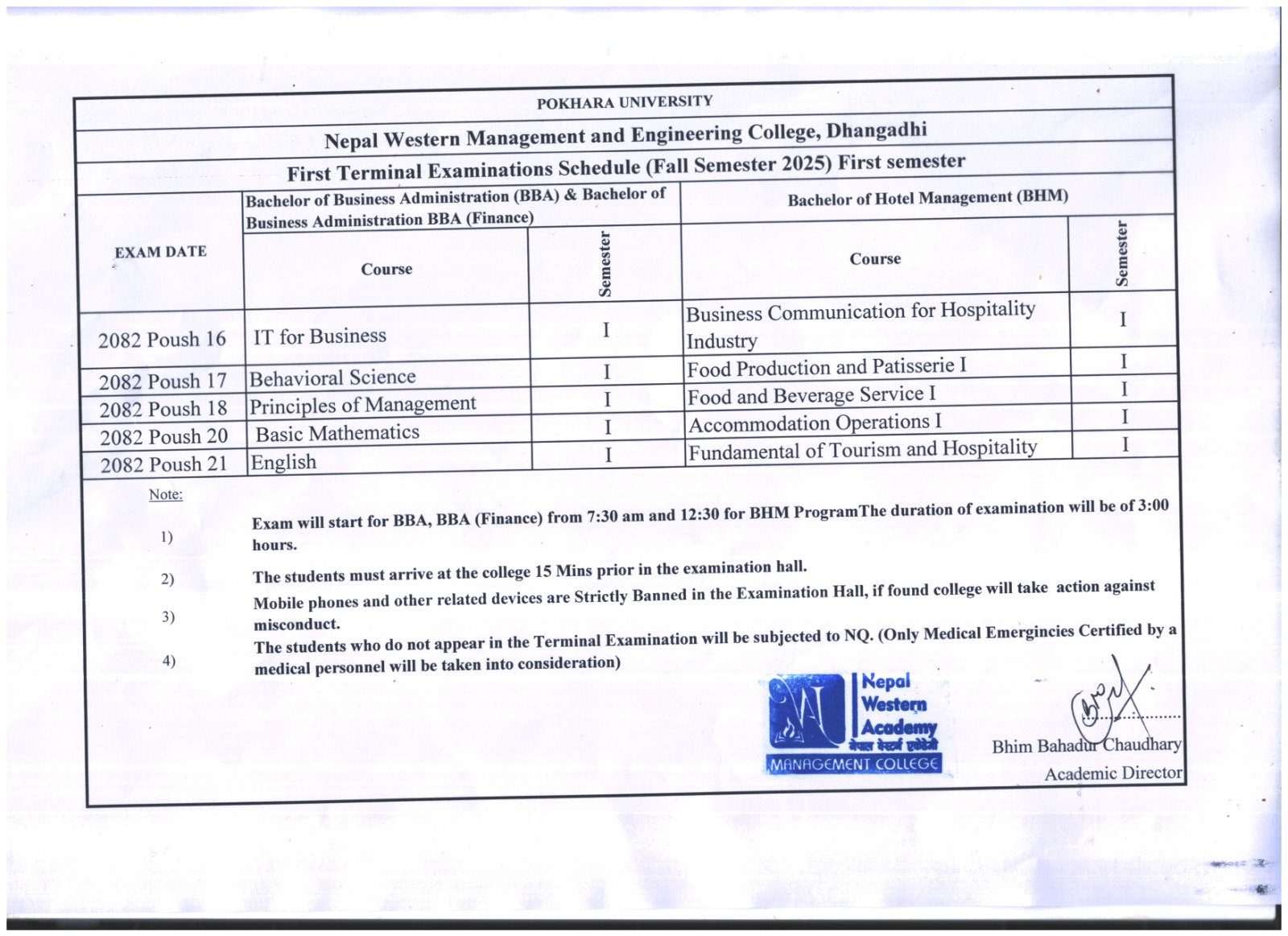 2082/09/08 BBA | BHM BBA-Finance 1st Semester को 1st Term Exam संचालन हुने सम्बन्धमा