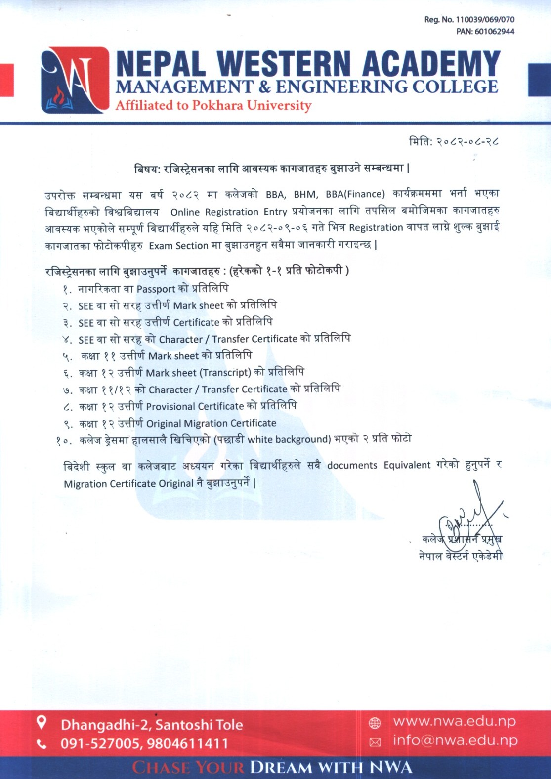 2082/08/28 रजिस्ट्रेसनका लागि आवश्यक कागजातहरू बुझाउने सम्बन्धमा