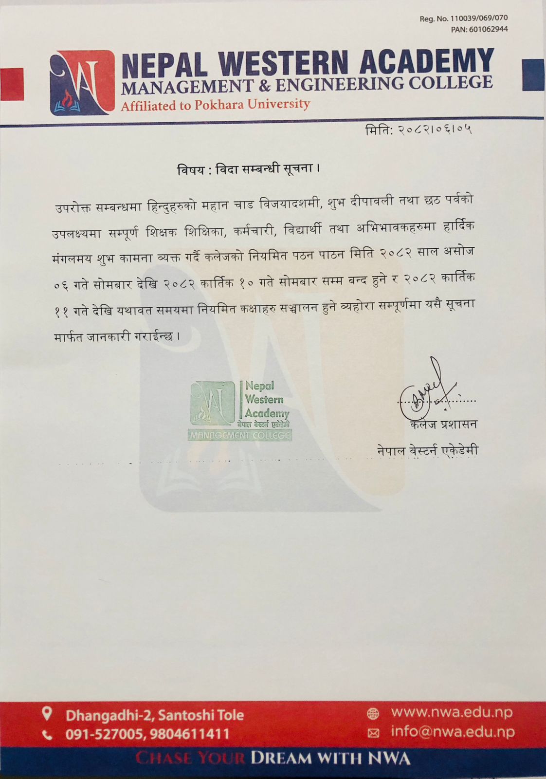 2082/06/05 दशै, तिहार र छठ पर्वको विदा सम्बन्घी सूचना